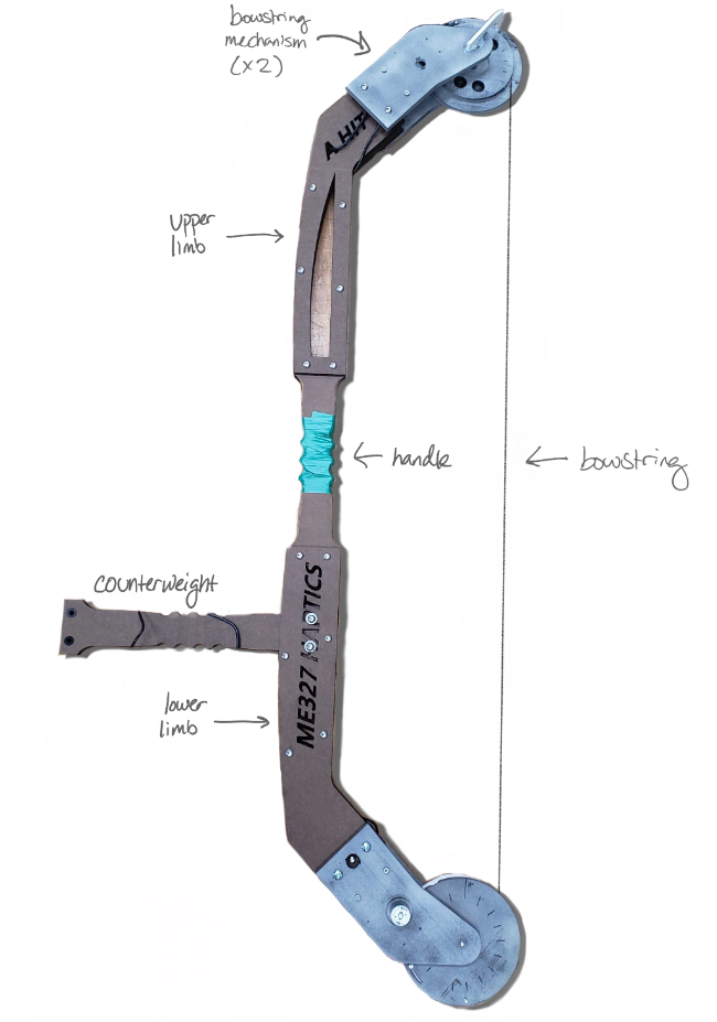 The bow was laser cut from 1/4" MDF board with two layers connected by spacers along the upper and lower limbs of the bow for added stiffness. The handle was constructed out of 3 layers of board sandwiched together. The bow body is attached to the bowstring mechanism using spacers and screws.