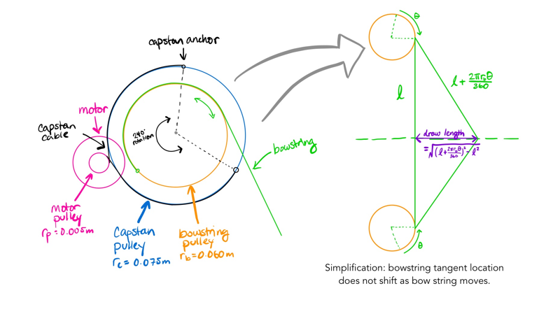 The bowstring mechanism uses a capstan drive and pulley mechanism to extend and retract the bowstring with the mechanism located at the top and bottom of the bow. The dimensions and ROM of the capstan pulley and bowstring pulley were determined based on the desired draw length, with a constraint to keep the capstan rotation < 360 degrees.