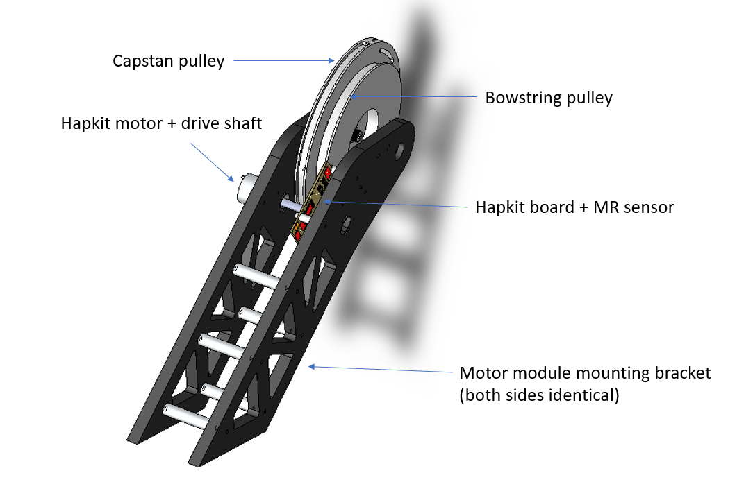Completed the mechanical design for the bowstring mechanism. It consists of the hapkit motor + board mounted to a capstan pulley similar to the hapkit which allows for 240 degrees of rotation. The bowstring is also fixed to the pulley which allows for the bowstring to wind/unwind as the user pulls on it. The dimensions of the pulley and the mounting points for the bowstring and the capstan cable were chosen to enable a 24" draw length. We have ordered hardware on McMaster and the custom parts are currently being 3D printed.