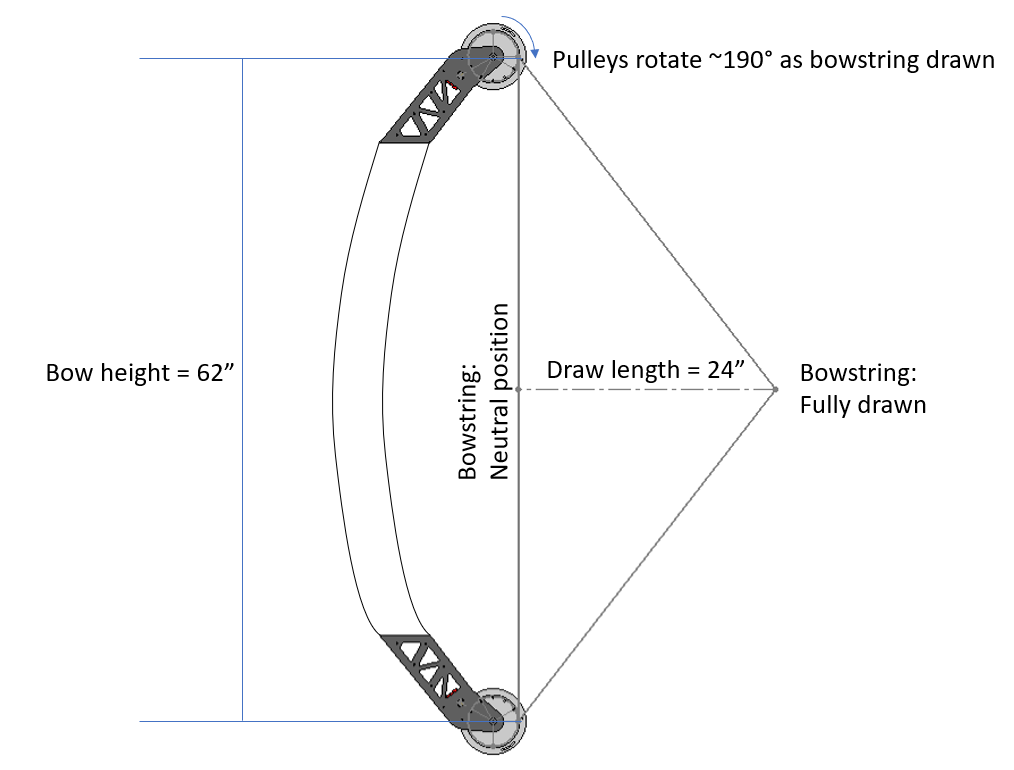Originally, the bow body was designed such that the height of the bow would be 62" to meet the bow length requirement for 25" draw length. However, when this first iteration was prototyped, the bow was far too heavy for a user to lift. The second and final iteration of the bow body shortened the bow height to 50" and shrunk its width to 3" in order to strike a balance between realistic bow size and overall weight.
